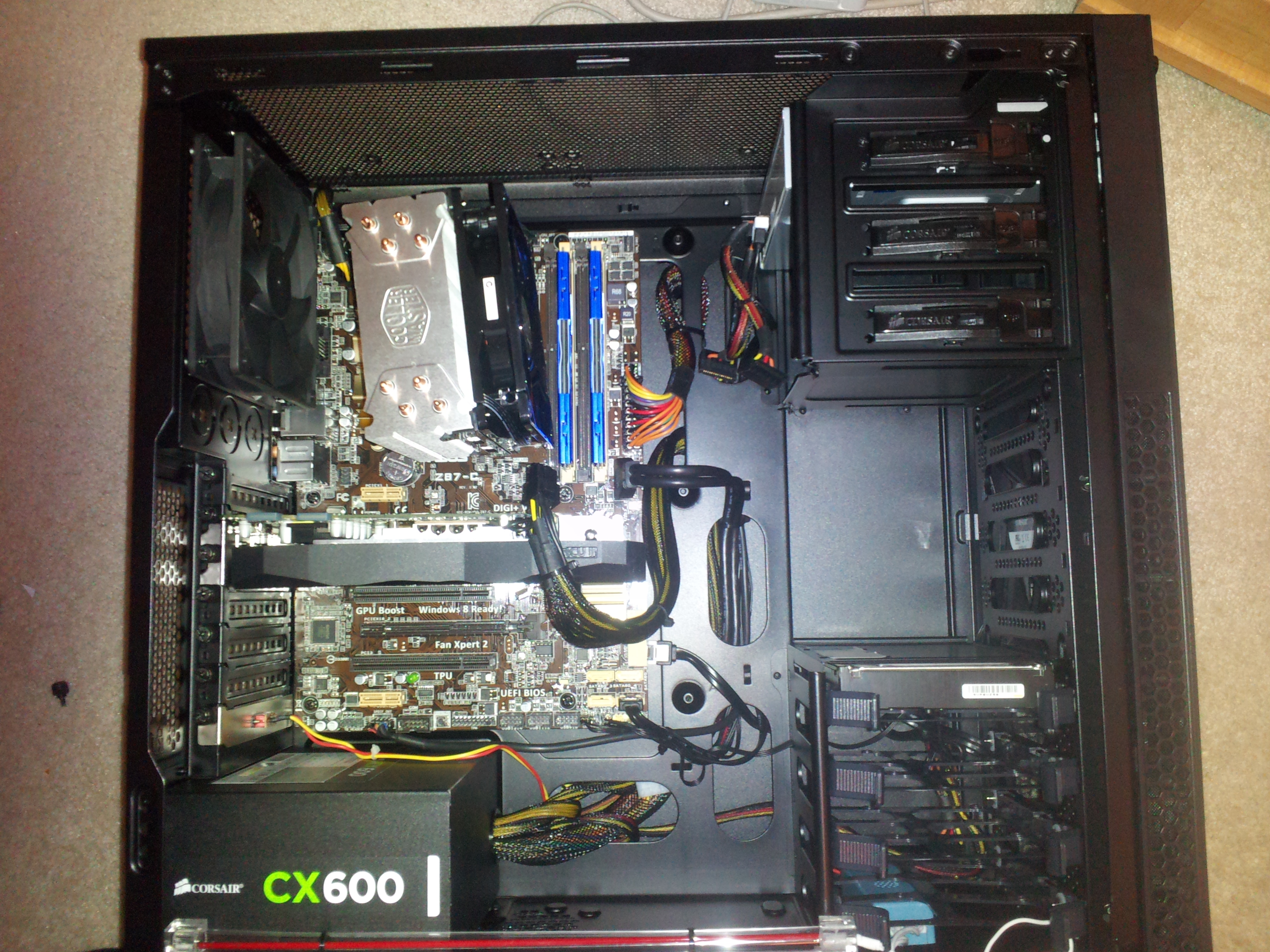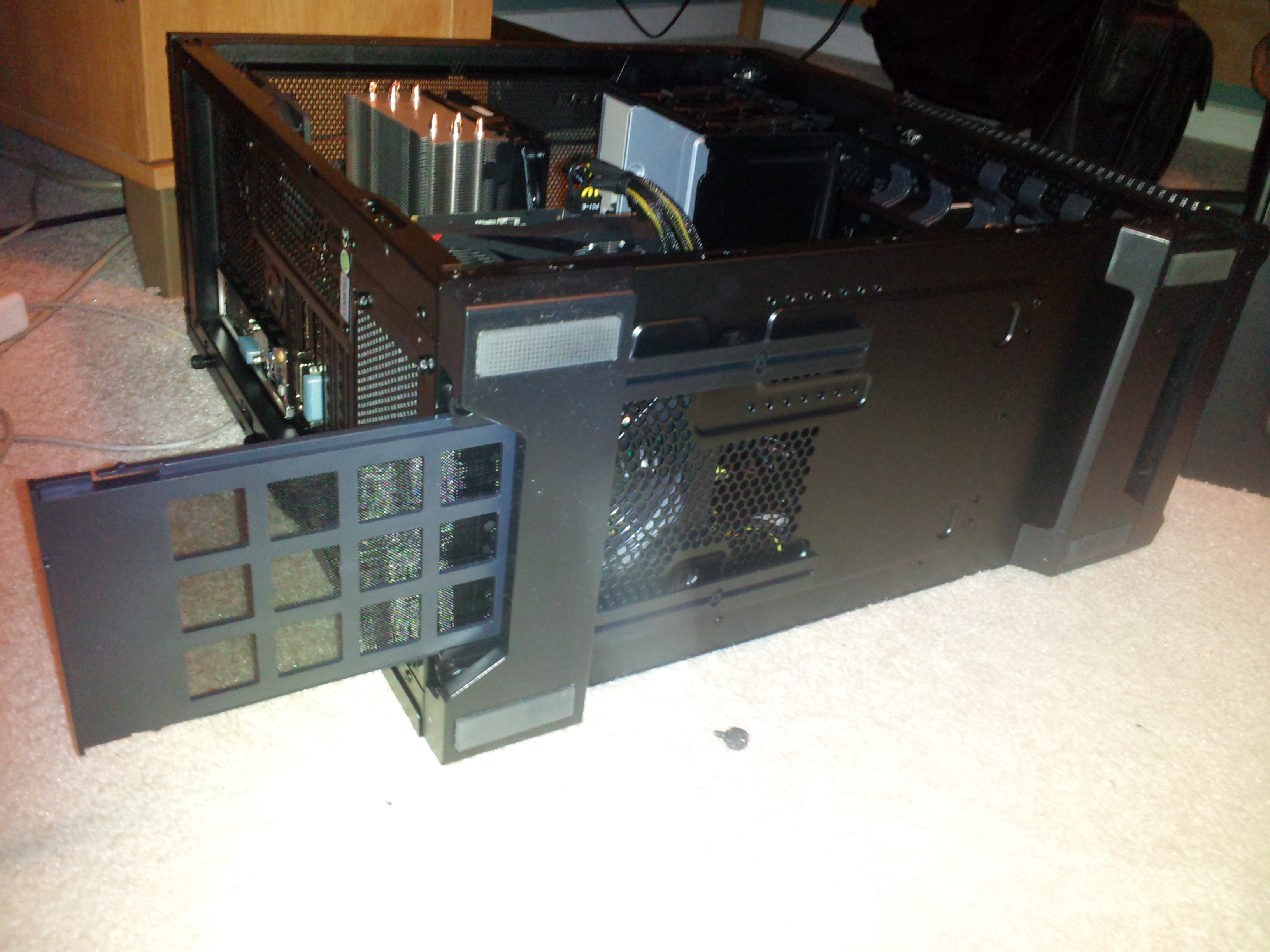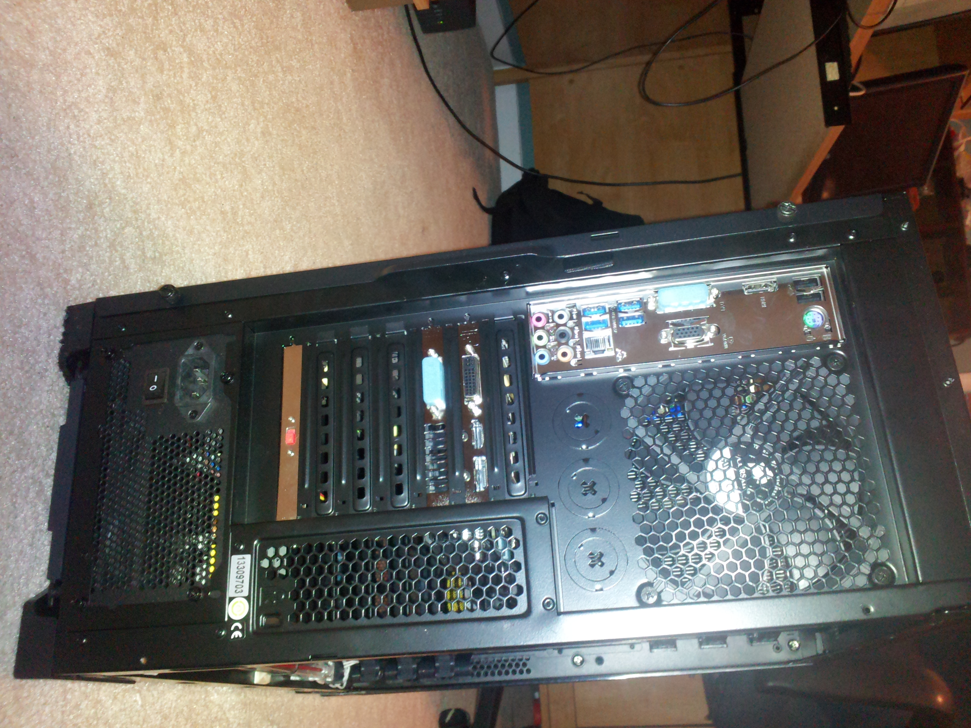 Now I see why the case is so large - the cables are routed neatly under the motherboard. I never even knew you could do this. I wouldn't have bothered. I guess that is a plus for neatness and airflow, but a minor inconvenience for maintenance. It has a nice big honking fan, but they were quite loud until I changed the BIOS setting to allow the mobo to vary their speed. I can't imagine why anyone would turn this off. Personally, I think the airflow is overkill.