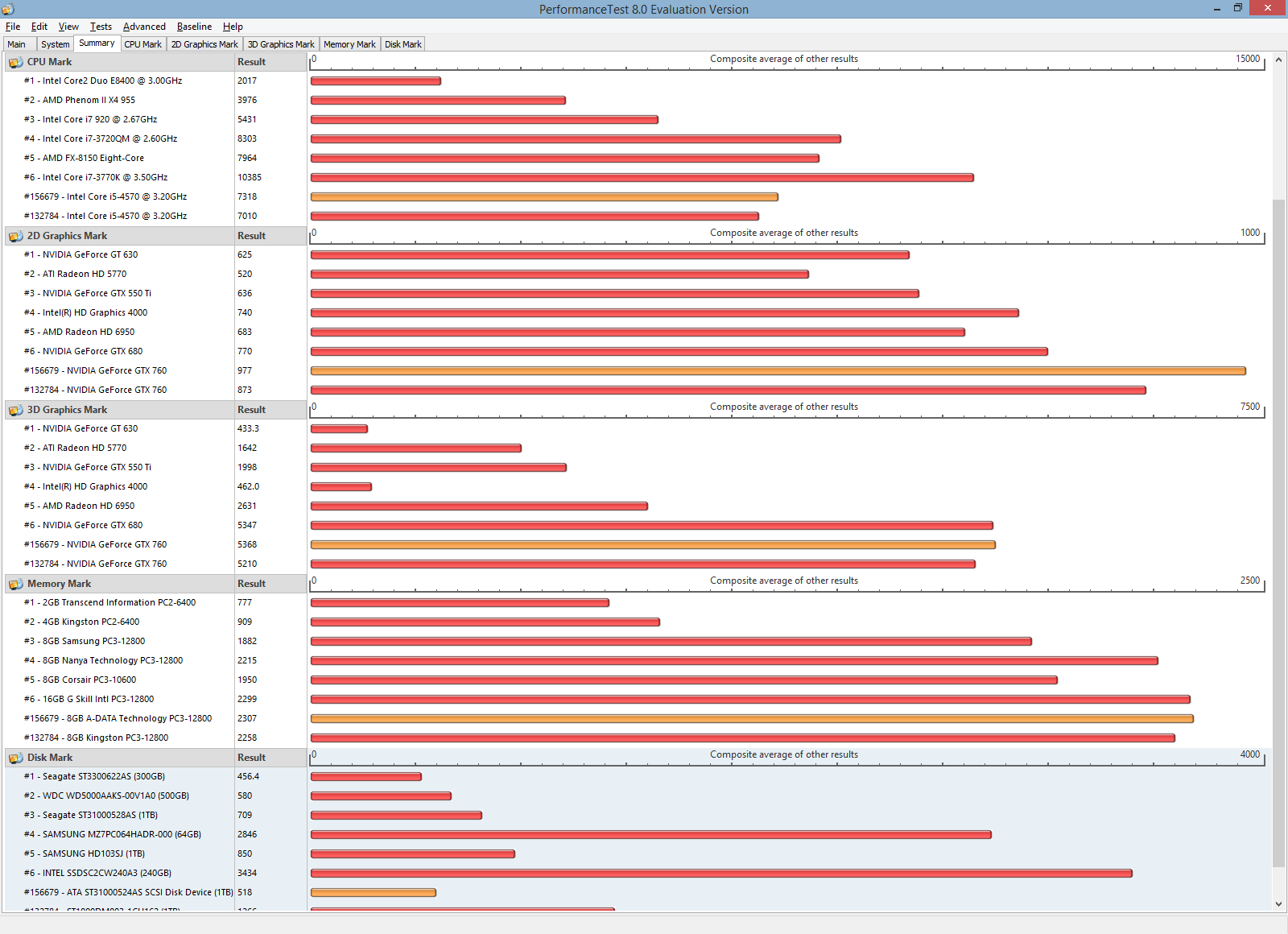 The Windows Experience index is slightly out-of-date but it confirmed that everything was working as expected. The Passmark scores for the video card and CPU were about 5% higher than average, which is nice to know! It just validates that Digital Storm didn't do something strange in the build or skimp somewhere. Use caution when comparing Passmark's overall score because their simple weighted average approach can be skewed by SSDs. Since the drive score can go up 10-fold with an SSD, even if Passmark weights the drive benchmark as only 30%, that means the score triples.